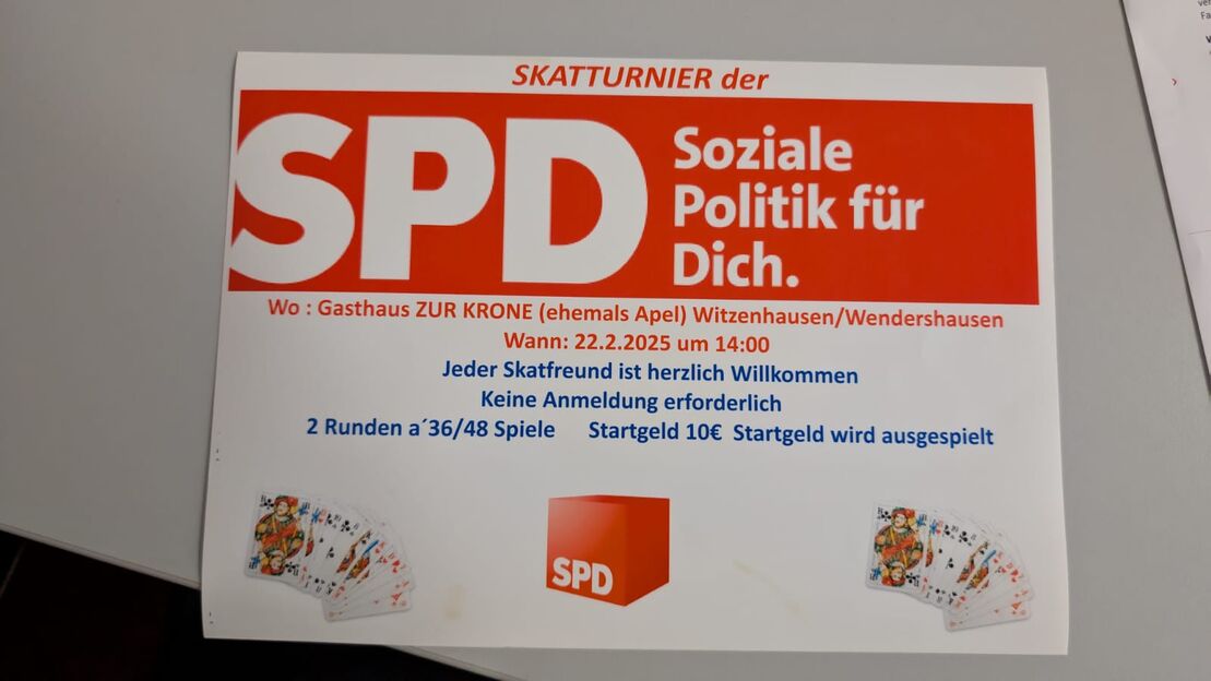 Am Samstag, den 22. Februar 2025, lädt die SPD Witzenhausen alle Skatfreunde zu einem geselligen Turnier ins Gasthaus ZUR KRONE (ehemals Apel) ein. Ab 14:00 Uhr werden in zwei Runden à 36/48 Spiele die besten Spielerinnen und Spieler ermittelt. Das Startgeld beträgt 10 €, das vollständig ausgespielt wird. Eine Anmeldung ist nicht erforderlich – wer Lust auf eine Partie Skat hat, ist herzlich willkommen.